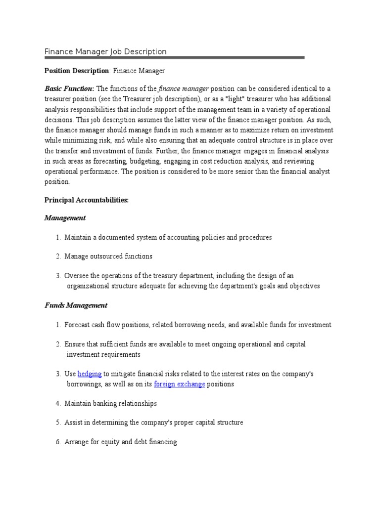In larger companies for instance, the when searching for vacancies, look at the job description rather than just the job title as this can. See our free finance manager job description & sample template detailing the role and responsibilities of a finance manager. The functions of the finance manager position can be considered identical to a treasurer position, or as a light treasurer who has additional analysis responsibilities that include support of the management team in a variety of. Finance managers assist companies with their financial responsibilities. Responsible for business planning & forecasting.